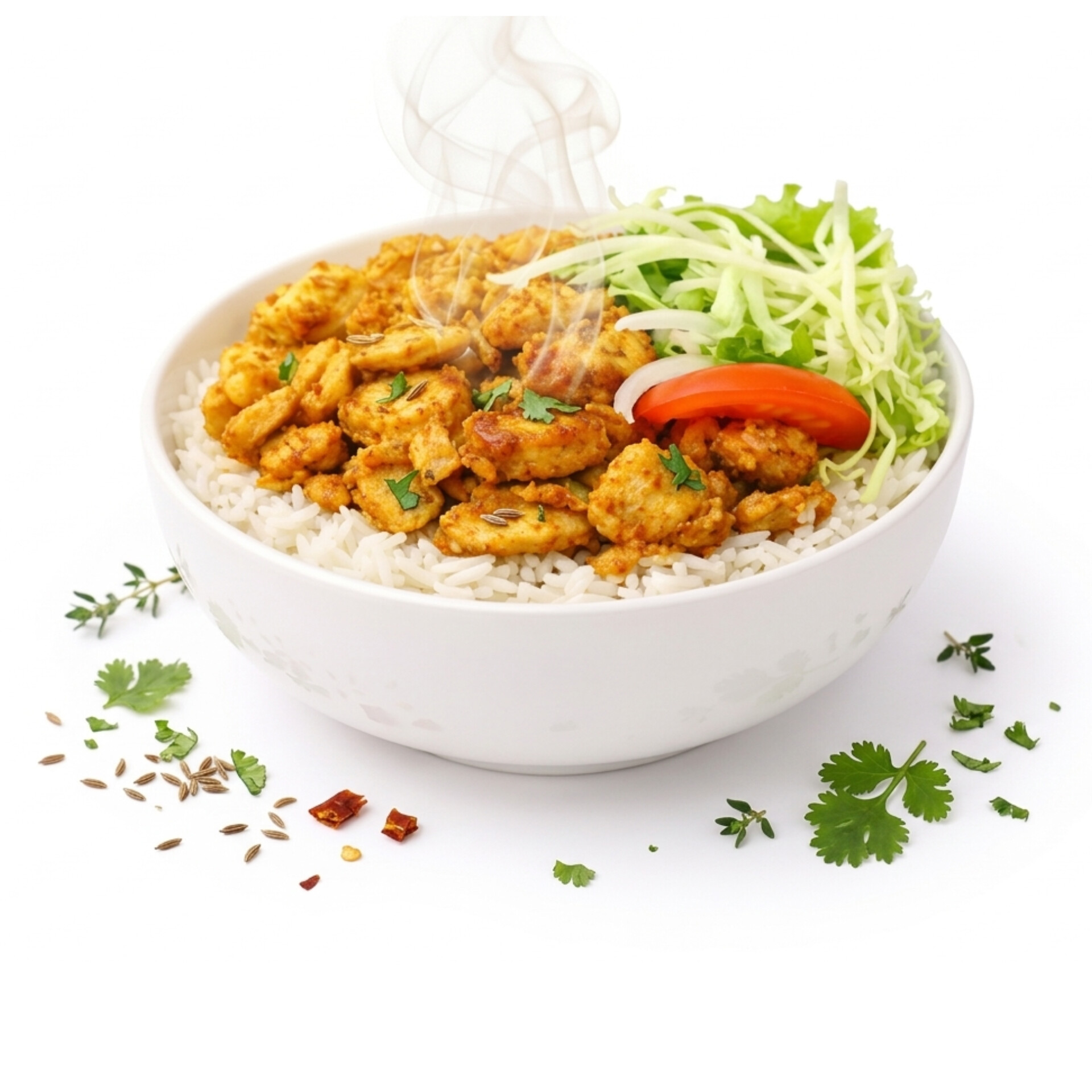スパイスとヨーグルトで下味をつけた鶏肉を焼き、それをキャベツ、トマト、ヨーグルトソースと一緒にご飯の上にのせた日本スタイルのケバブ丼